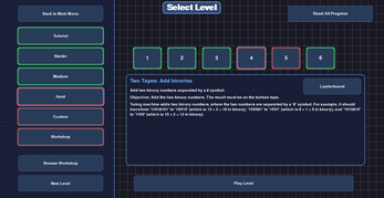 - Levels (Solve levels by building Turing Machines)