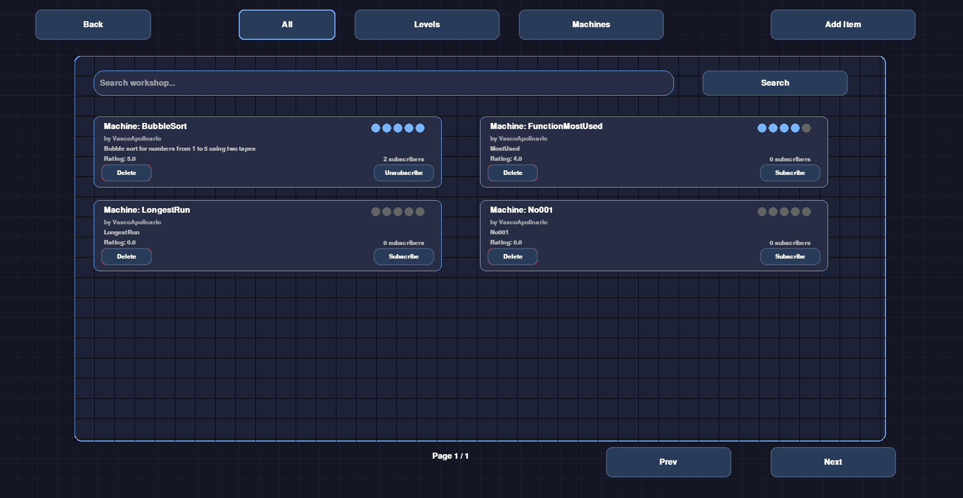 - Workshop support for sharing levels/machines